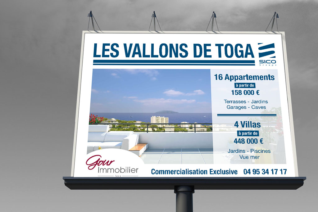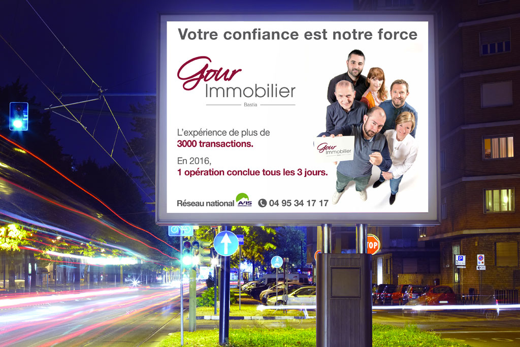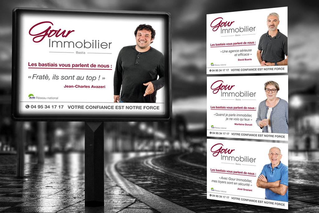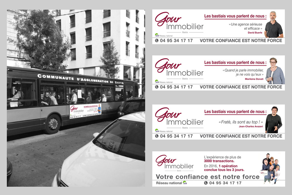 Mise en place d’une campagne d’affichage annuelle sur les supports bus et 4x3. Une première opération « coup de poing » avec la création d’un visuel mettant en scène la vraie équipe de l’agence Gour Immobilier pour valoriser une équipe dynamique. Pour la 2ème phase de la campagne, une communication testimoniale, qui a fait parler des vrais clients de l’agence, des personnages forts de Bastia et sa région afin d’asseoir la notoriété de l’agence et renforcer la proximité. Conception d’une baseline percutante et en adéquation avec les visuels. Un suivi et conseil pour les réseaux sociaux.